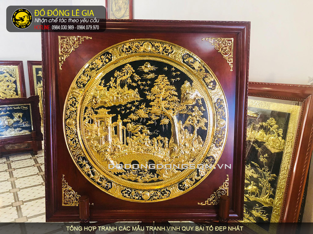 Tranh Vinh Quy Bái Tổ khung gỗ gụ KT 155cmx155cm, mạ vàng 24k 3 lớp, chạm thủ công hoàn toàn