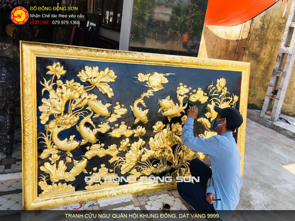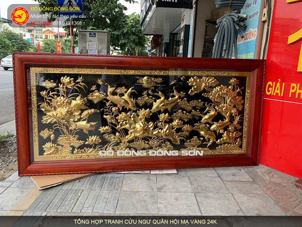 Tranh cửu ngư quần hội KT 1m55x1m27 khung gỗ Gụ đuch hoa văn, lòng tranh mạ vàng 24k