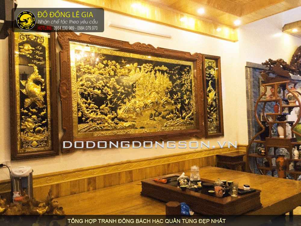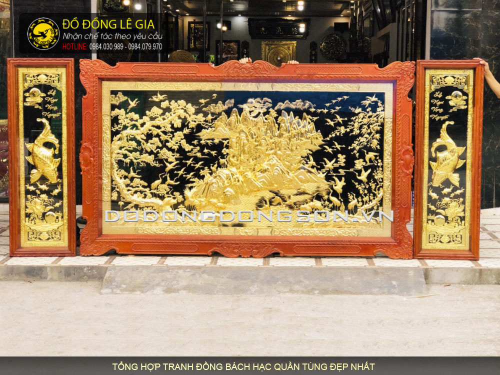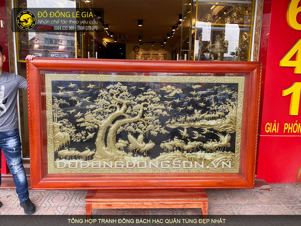 Tranh Bách Hạc Quần Tùng, Bác hạc quần sơn được các nghệ nhân Lê Gia chế tác hoàn toàn thủ công bằng tay mang đến có sản phẩm có độ tinh xảo, sắc nét nhất. Nguyên liệu là loại đồng vàng nguyên tấm được nhập khẩu tại Hàn Quốc. Khung tranh được làm từ gỗ cao cấp, tuyển trọn kỹ lưỡng và được xử lý rất chắc chắn không lo bị mọt, sủi,…Khung có nhiều loại như khung gỗ gụ, gỗ trò, gỗ hương, khung trơn, khung chạm hoa văn hoặc khung liền đồng.