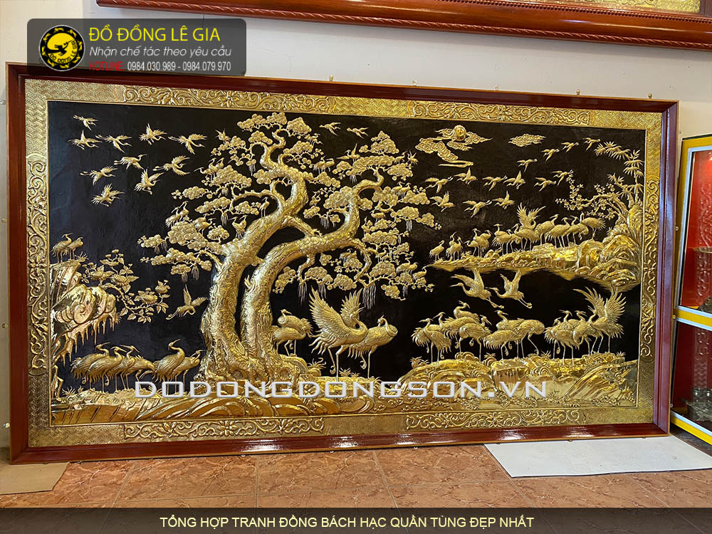 Tranh Bách hạc quần tùng KT 2m33x1m33 bằng đồng khung gỗ hương