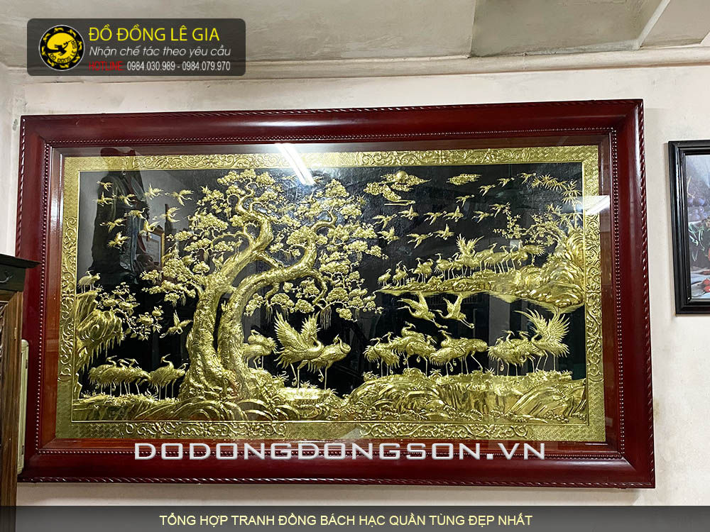 Tranh Bách hạc quần sơn KT 2m62x1m55 bằng đồng mạ vàng 24k khung gỗ hương đỏ