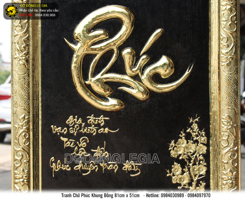 Tranh chữ Phúc khung đồng được chế tác thủ công bằng cách thúc trên nền tấm đồng dày 8 rem. Sau khi thúc, chạm tỉa chi tiết các hoa văn, tranh được đem đi mài trơn trước khi mạ vàng và làm màu.