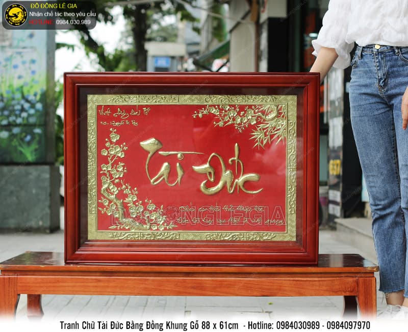 | Tên sản phẩm: | Tranh Chữ Tài Đức bằng đồng khung gỗ trò 88x61cm |