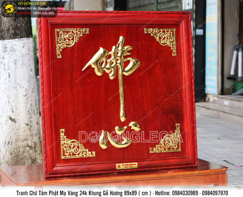 Tranh chữ Tâm Phật bằng đồng mạ vàng 89cmx89cm chế tác thủ công tinh xảo, mạ vàng 24K sang trọng, khung gỗ hương cao cấp. Vật phẩm phong thuỷ trang trọng, thích hợp làm quà tặng ý nghĩa cho khách hàng, đối tác, người thân trong dịp lễ, Tết.
