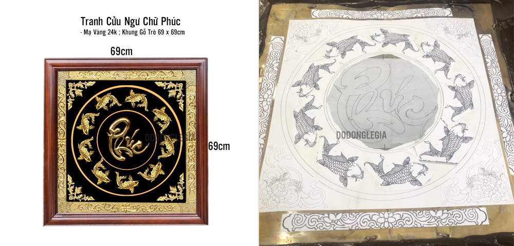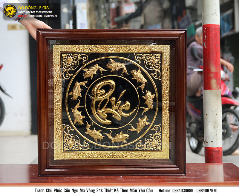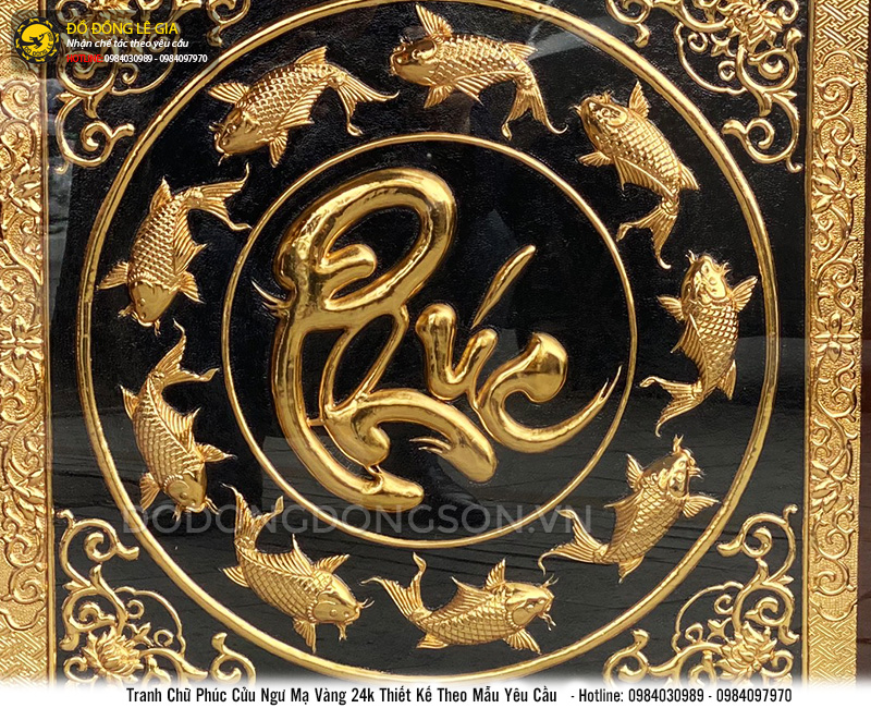 Bức tranh với kết cấu gồm hai phần, chính giữa bức tranh là hình ảnh chữ “Phúc” được chế tác bằng đồng mạ vàng 24k, được bao xung quanh bởi “cửu ngư quần hội". Để bức tranh thêm phẫn nhã nhặn, các nghệ nhân của thương hiệu Đồ đồng Lê gia cũng khéo léo lồng ghép hình ảnh viền hoa được chạm khắc một cách tỉ mỉ, cốt để bức tranh thêm có sắc, có hồn.