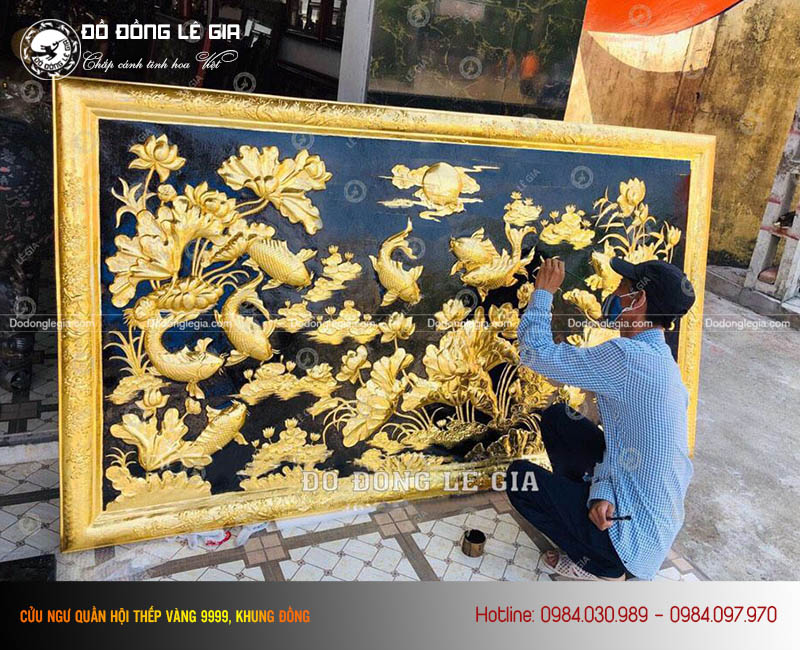 Tranh cửu ngư quần hội thếp vàng 9999 có vẻ đẹp tinh xảo, lộng lẫy, sang trọng lại là biểu tượng cho sự sung túc, tài lộc dồi dào. Do đó bức tranh là sự lựa chọn tuyệt vời để trang hoàng nhà cửa, văn phòng hoặc làm quà biếu tặng.