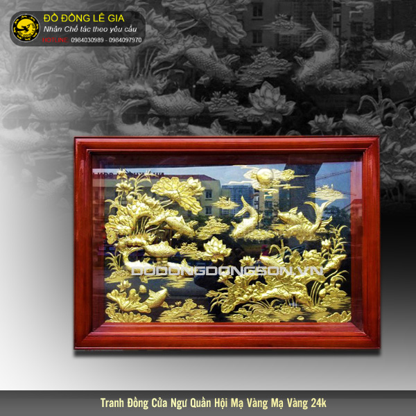 Bức tranh miêu tả cảnh sắc thiên nhiên vô cùng thơ mộng của đêm trăng thanh gió mát với ánh trăng tròn, hồ hoa sen và 9 con cá chép quần tụ trong hồ. Tranh được mạ vàng 24k thanh khiết nên có vẻ bề ngoài rực rỡ, lộng lẫy, vô cùng bắt mắt. Việc lựa chọn treo tranh góp phần tạo không gian đẹp hơn, sinh động, sang trọng hơn, thể hiện gu thẩm mỹ tinh tế của gia chủ.