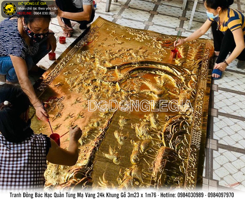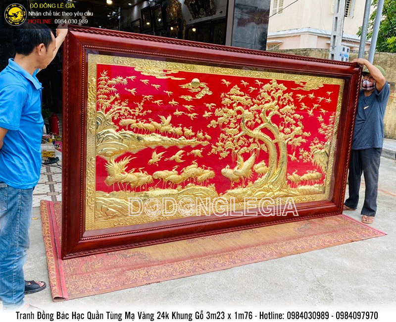 Mẫu tranh đây được Lê Gia chế tác theo phương thức chạm thúc tay thủ công trên nền tấm đồng vàng dày 8 rem. Đây là độ dày đảm bảo khi thúc vẫn giữ nguyên chi tiết tranh, không bị thủng khi thúc và giúp cho nền tranh được phẳng. Tránh bị mấp mô như những dòng tranh thường, giá rẻ. Bức tranh phác họa hình ảnh 100 con Hạc bay lượn, đậu bên cây tùng.