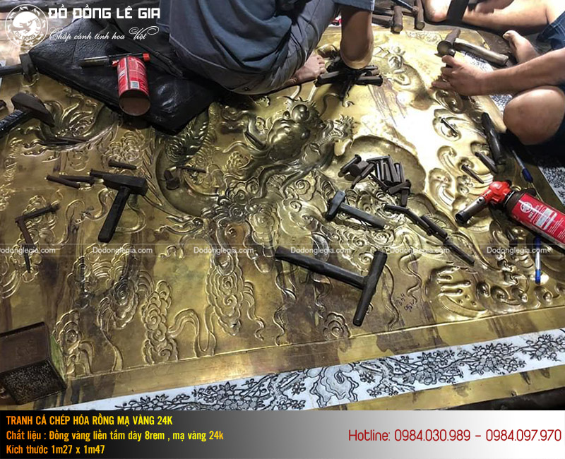 Tranh đồng cá chép hóa rồng mạ vàng 24k được chế tác hoàn toàn thủ công theo phương pháp truyền thống. Mọi công đoạn đều được gò, chạm, chế tác bằng tay. Dưới bàn tay của các nghệ nhân Lê Gia, bức tranh cá chép hóa rồng hiện lên tinh xảo, sắc nét và tỉ mỉ trong từng đường nét.
