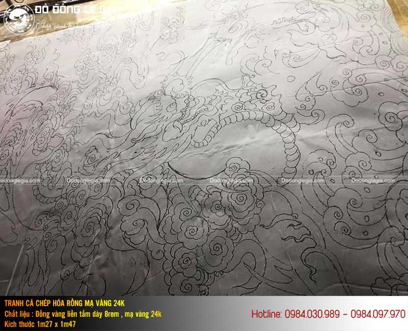Nguyên liệu chọn lựa làm tranh là đồng vàng nguyên tấm nhập khẩu Hàn Quốc, có độ dày 8 rem giúp tranh có độ bền cao, không bị rỗ, nổi lõm khi chạm khắc. Hình tượng cá chép thông minh, nhanh trí và hoạt bát cùng với linh vật rồng uy vũ, đầy sức mạnh. Bức tranh đã phần nào khắc họa nên cảnh tượng sống động của truyền thuyết “cá chép vượt vũ môn hóa rồng” xưa.