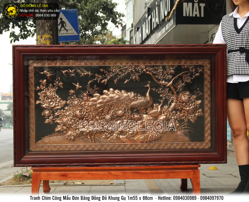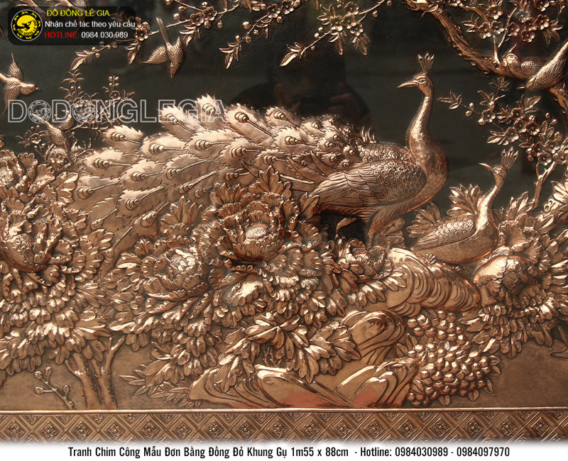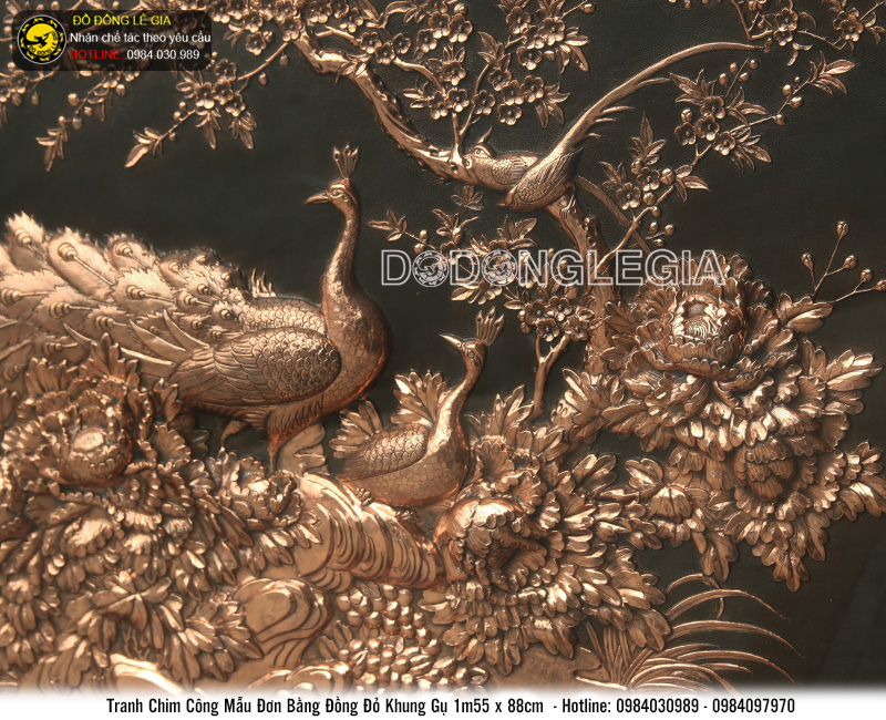 Tranh đồng Chim Công Mẫu Đơn được các nghệ nhân lành nghề của thương hiệu Đồ đồng Lê gia chế tác với chất liệu đồng đỏ - một chất liệu vô cùng bền bỉ với thời gian cùng quy cách Thúc thủ công trên nền tấm đồng dày 8 rem. Bức tranh đồng khắc họa hình ảnh của một đôi Chim công đang quấn quýt bên nhau, các nghệ nhân Lê gia còn nhấn nhá thêm hình ảnh hoa mẫu đơn để bức tranh thêm ấn tượng, sinh động.