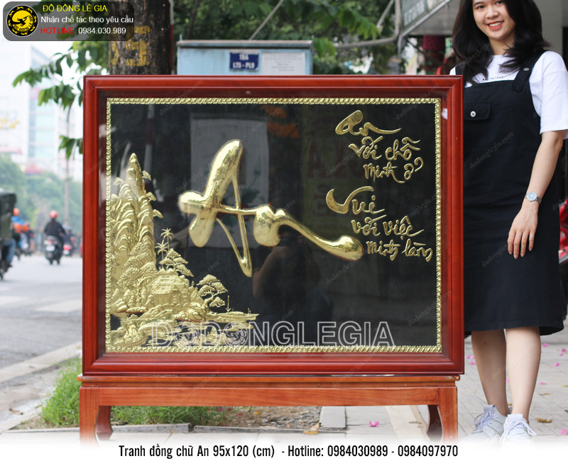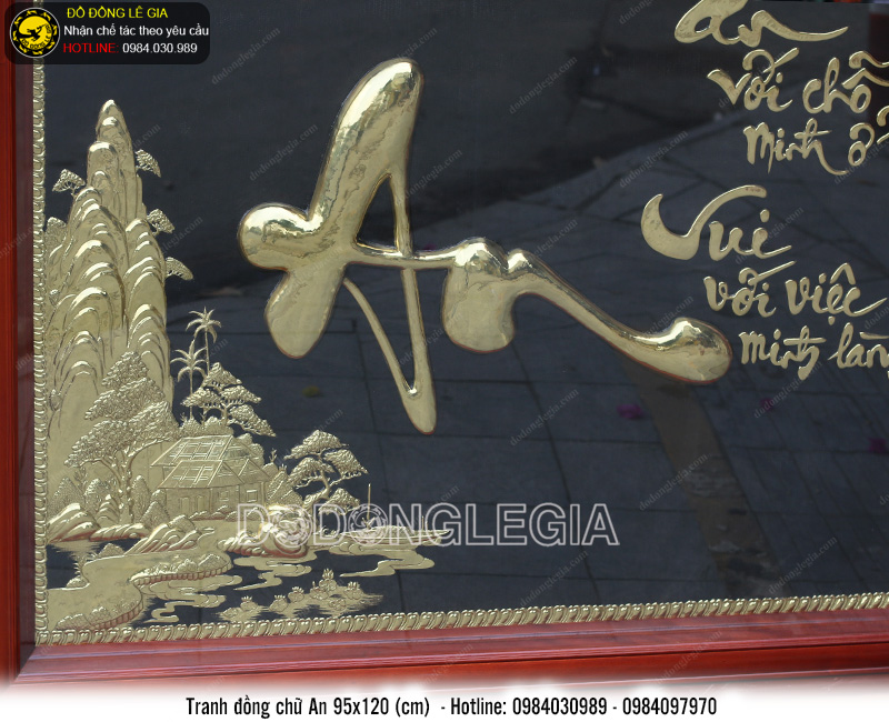 Khung gỗ hương bao bên ngoài tranh chữ An bằng đồng tạo nên sự chắc chắn, bền đẹp của tranh. Đồng thời, sự kết hợp giữa yếu tố Mộc (gỗ), Kim (đồng, vàng), mang đến nhiều ý nghĩa phong thủy hơn cho gia chủ khi sở hữu. Ngoài các kích thước có sẵn, tranh chữ An bằng đồng, đồ đồng Lê Gia còn nhận chế tác tranh chữ theo yêu cầu của quý khách. Bạn chỉ cần liên hệ, Lê Gia sẽ hỗ trợ và giúp bạn hoàn thành.