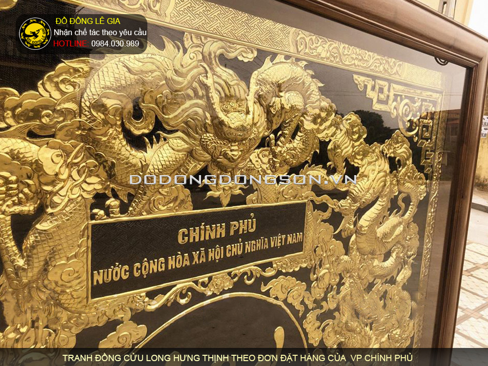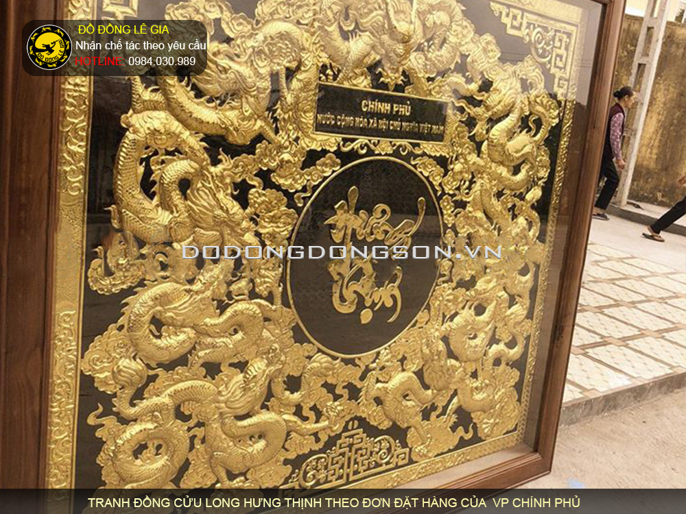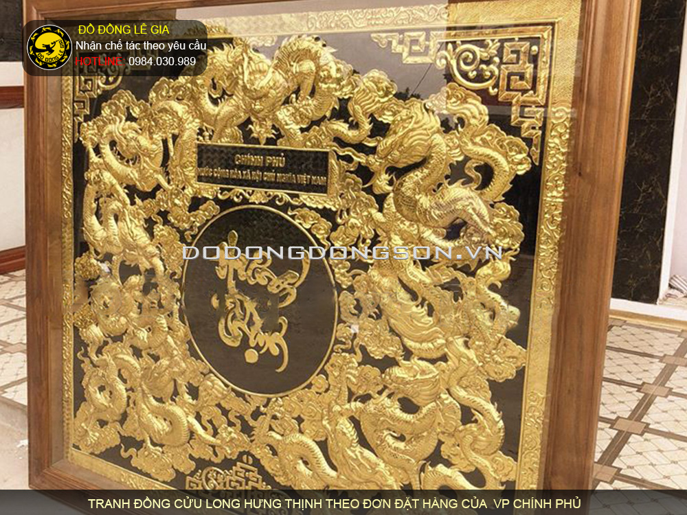 Tranh Cửu Long Hưng Thịnh là biểu tượng đại diện cho sự quyền lực, công danh, thể hiện quyền uy và sự hưng thịnh. Tranh cửu long được chạm hoàn toàn thủ công từ nguyên liệu đồng vàng nhập khẩu tại Hàn Quốc, tranh được chính các nghệ nhân trực tiếp chế tác và hoàn thiện. Tranh được thiết kế từ đồng vàng dày 8rem, chạm tinh xảo, sắc nét đẳng cấp từng nét nhỏ. Tấm đồng luôn đảm bảo không sợ bị thủng khi chế tác. Khung tranh được làm bằng gỗ gụ loại tốt nhất được tuyển chọn kỹ lưỡng, vân gỗ đều không tỳ vết.