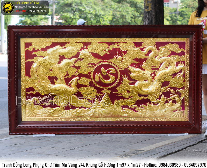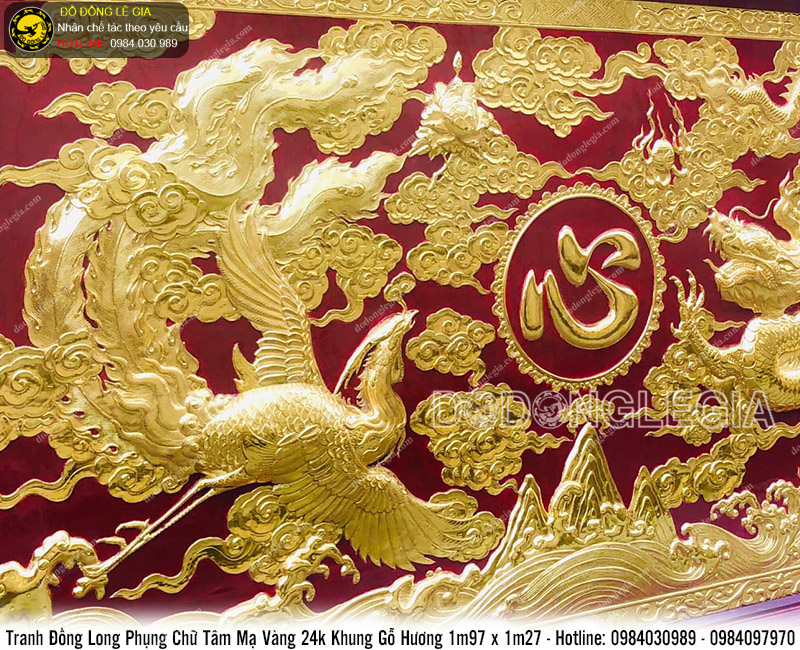 Tranh đồng Long Phụng chữ Tâm mạ vàng 24k với chữ Tâm được khắc bằng chữ hán ở chính giữa bao bọc xung quanh là những cánh hoa cùng với hai Thần thú Long Phụng ở hai bên đã mang đến một một sự truyền cảm và ý nghĩa sâu sắc khi nhìn vào bức tranh. Bức tranh mang đến tài lộc, sự may mắn, sự sung túc đoàn viên của gia đình cho gia chủ. Đồng thời cũng khuyên con người nên sống một cuộc sống lương thiện, làm nhiều việc tốt, yêu thương gia đình. Đây thật sự là một bức tranh rất ý nghĩa.