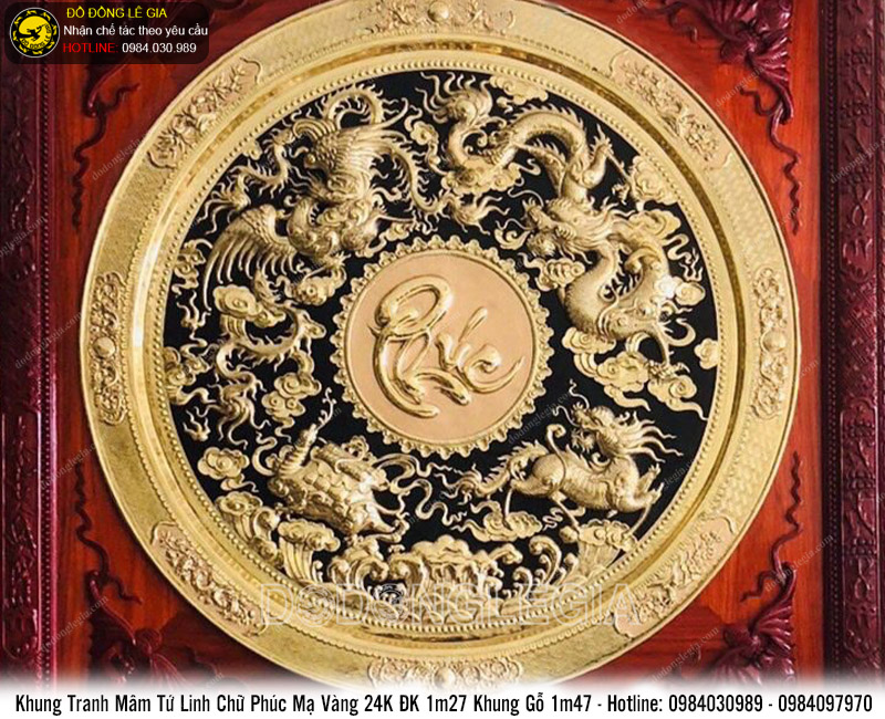| Tên sản phẩm: | Tranh đồng Mâm tứ linh chữ Phúc mạ vàng 24k |