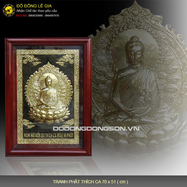 Đồ đồng Lê Gia chuyên cung cấp những mẫu tranh đồng làm quà biếu tặng, tranh chữ bằng đồng,... xin giới thiệu đến quý bạn đọc bức tranh đồng tượng Phật Thích Ca Mâu Ni làm từ đồng mạ vàng 24k, kích thước 70x51cm, phù hợp để treo trong không gian nội thất.