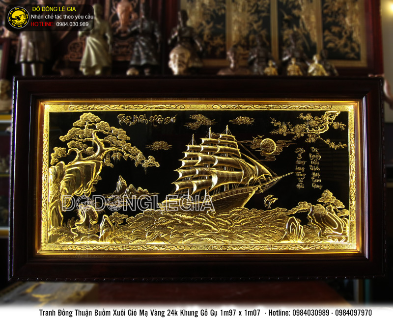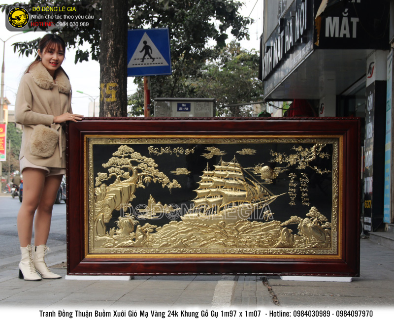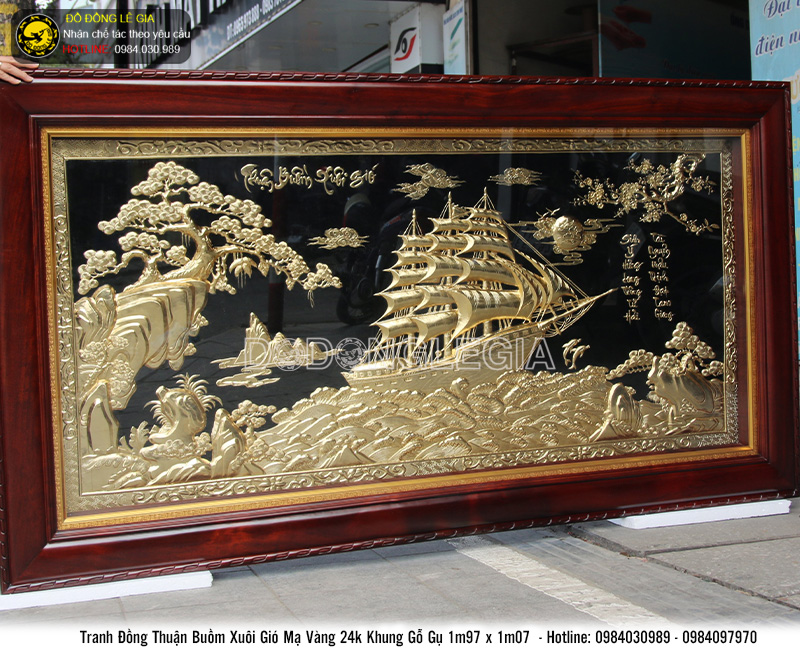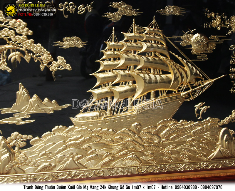 Bức tranh Thuận buồm xuôi gió là một bức tranh đồng phong thủy được chế tác tinh xảo với chất liệu đồng vàng nhập khẩu, bề mặt tranh được mạ vàng 24k và được đóng khung gỗ gụ cao cấp. Tranh được các nghệ nhân lành nghề của Lê Gia chế tác bằng phương pháp thúc thủ công trên nền tấm đồng dày 8 rem.