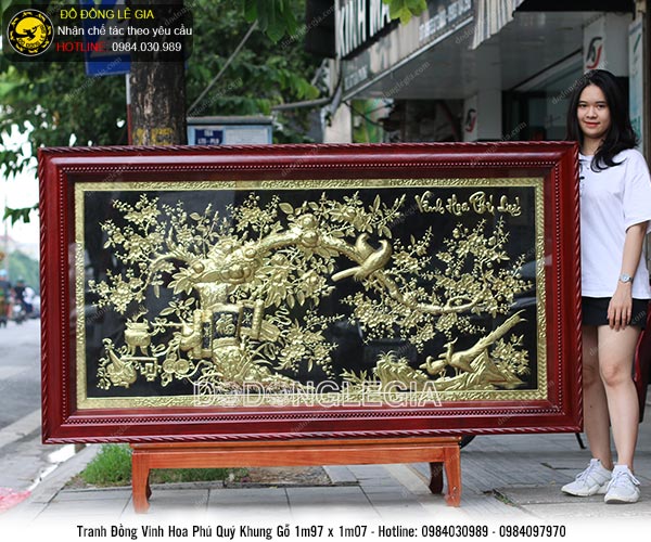 Tranh đồng Vinh Hoa Phú Quý 197x107cm là tác phẩm thủ công mỹ nghệ cao cấp, được chế tác bởi nghệ nhân lành nghề tại xưởng Lê Gia – thương hiệu uy tín hàng đầu trong lĩnh vực đồ đồng truyền thống. Tranh có kích thước lớn: dài 197cm, cao 107cm, thích hợp để trưng bày tại những không gian sang trọng như phòng khách, phòng họp, sảnh công ty hay biệt thự.
