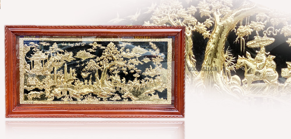- Về nguyên liệu: tranh được chạm từ đồng vàng liền tấm nhập khẩu Hàn Quốc. Đồng dày tiêu chuẩn 8 rem thuận lợi cho việc chế tác dễ dàng mà không sợ bị thủng, cong vênh.