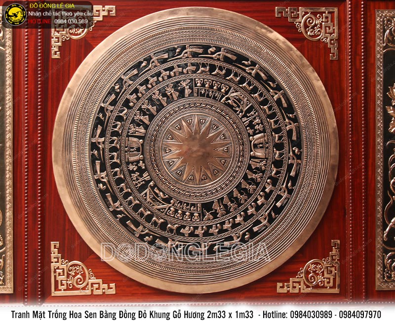 | Tên sản phẩm: | Tranh mặt trống đồng hoa sen khung gỗ hương KT 2m33x1m33 |