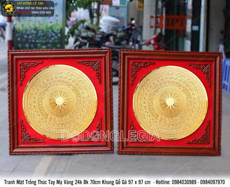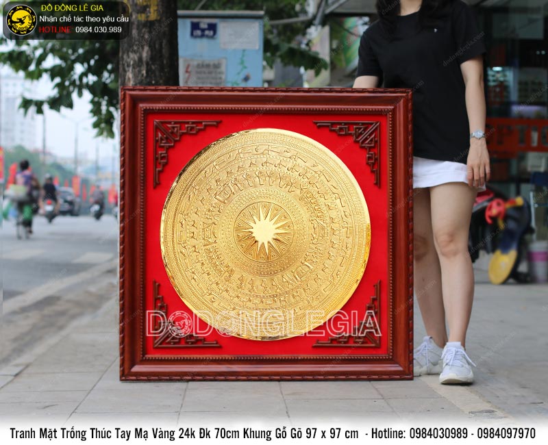 Tranh mặt trống đồng mạ vàng có kích thước vuông 97cm (chuẩn theo yêu cầu). Trung tâm nổi bật bởi mặt trống đồng đồng sơn mạ vàng. Các họa tiết hoa văn đều được thúc nổi. Xung quanh nền tranh bốn góc được thúc nổi 4 hoa văn góc tạo điểm nhấn.