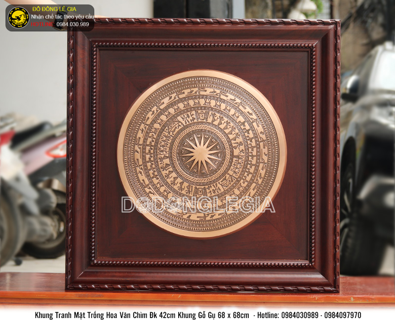 | Tên sản phẩm | Tranh mặt trống đúc chìm đường kính 42cm khung gỗ gụ 68x68 |