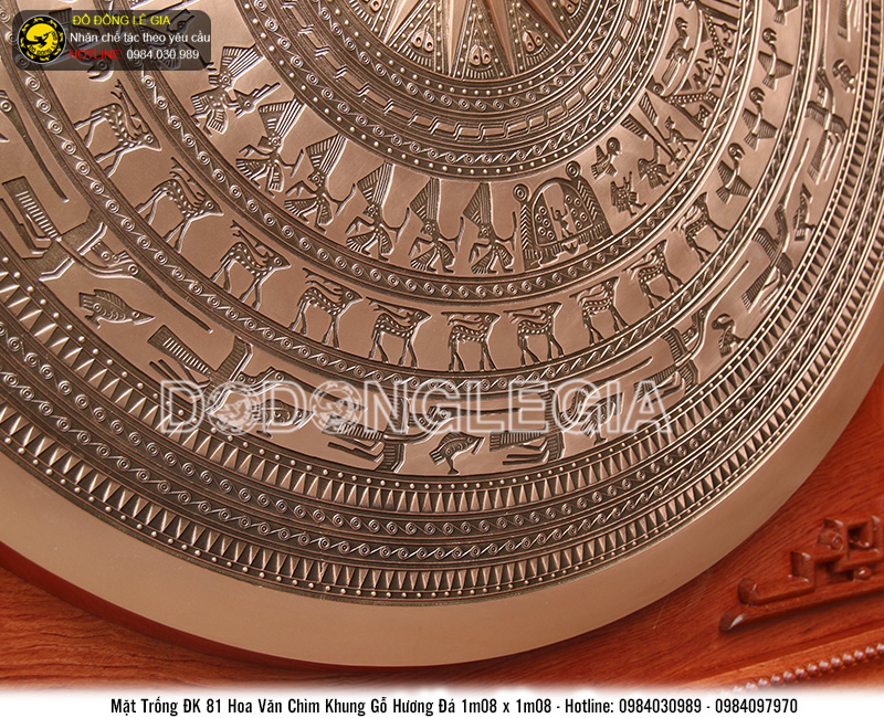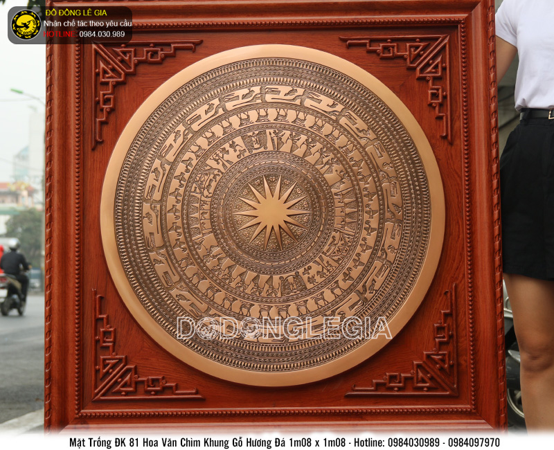 Chất liệu: Mặt trống đúc bằng đồng đỏ, khung gỗ hương đá