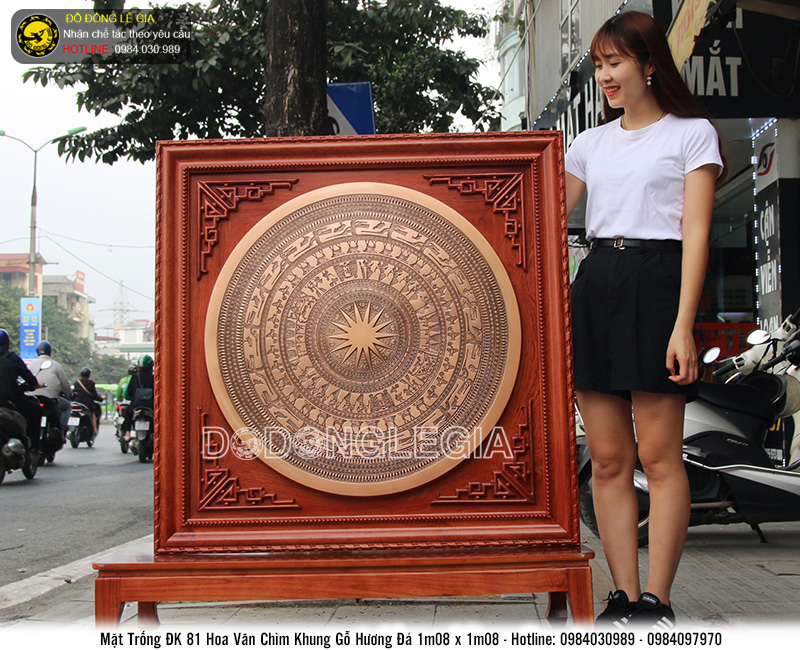Kích thước: Mặt trống đường kính 81cm, khung gỗ kích thước 108cmx108cm