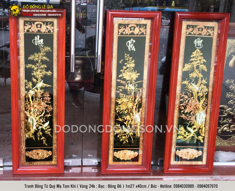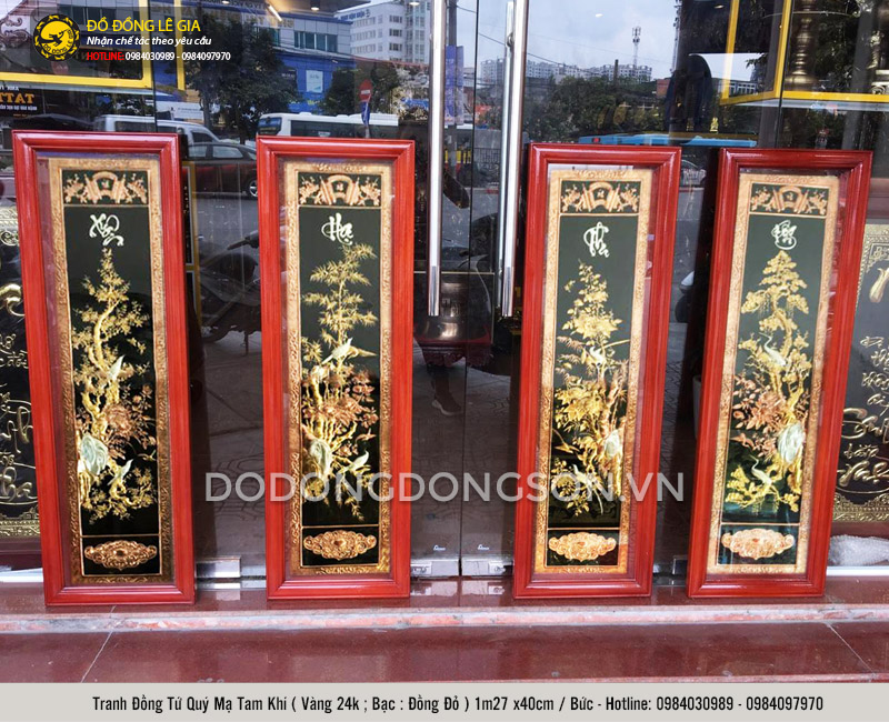 Tranh tứ quý ở đây gồm bộ 4 bức tranh rời nhau, mỗi bức tranh thể hiện hình ảnh của mỗi loại cây đại diện cho 4 mùa trong năm là tùng, cúc, trúc, mai. Hình ảnh của những loài cây đó được khắc hoạ trên tấm đồng cao cấp dày 8 rem của Hàn Quốc. Và được chạm thủ công từ đôi bàn tay khéo léo của những nghệ nhân có kinh nghiệm lâu năm. Do đó, ấn tượng đầu tiên khi nhìn vào tranh tứ quý mạ tam khí của Đông Sơn đó là độ tinh xảo, chính xác đến từng chi tiết, cho người nhìn cảm nhận ngay được cái hồn riêng của bức tranh, khung cảnh bốn mùa như đang hiện hữu ngay trước mắt.