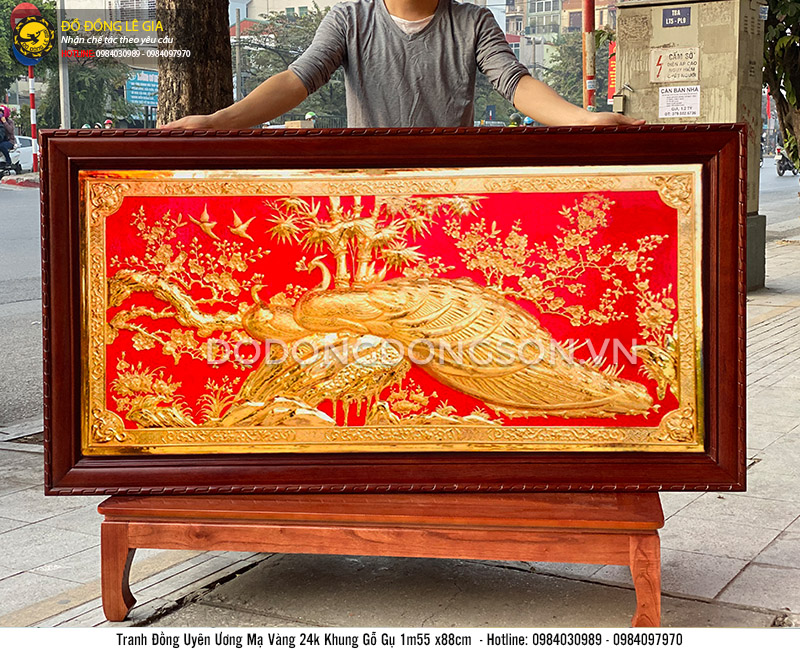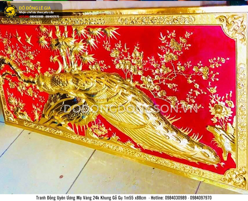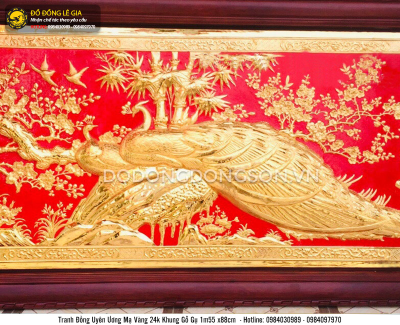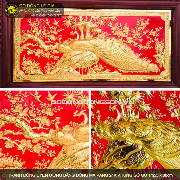 Tranh uyên ương đồng mạ vàng 24k khung gỗ gụ