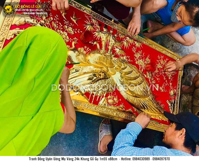 Bức tranh uyên ương được chế tác hoàn toàn thủ công bằng tay, qua sự tài tình cũng kinh nghiệm của các nghệ nhân mà bức tranh trông thật sống động. Nguyên liệu làm nên bức tranh là đồng vàng nguyên tấm, độ dày 8rem giúp tranh đồng bền, đẹp, không rỗ, lõm khi chế tác. Sau khi hoàn thành, tranh uyên ương được mạ lớp vàng 24k giúp bức tranh có màu sắc nổi bật, ánh vàng độc đáo. Đồng thời giúp nâng cao độ bền theo thời gian.