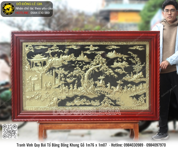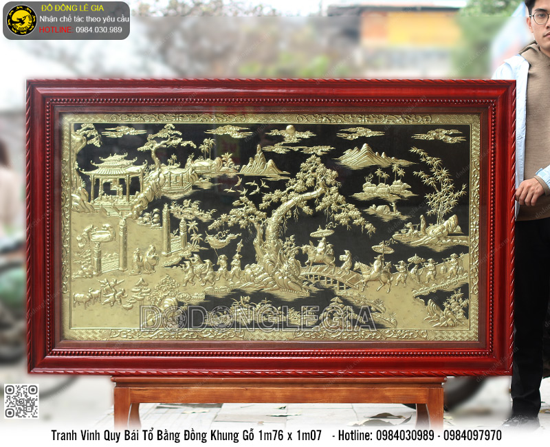 Tranh Vinh Quy Bái Tổ bằng đồng khung gỗ 1m76 x 1m07 là tác phẩm nghệ thuật cao cấp, chạm tay 100%, mang ý nghĩa sâu sắc về truyền thống hiếu học, rất thích hợp để trưng bày và biếu tặng sang trọng.