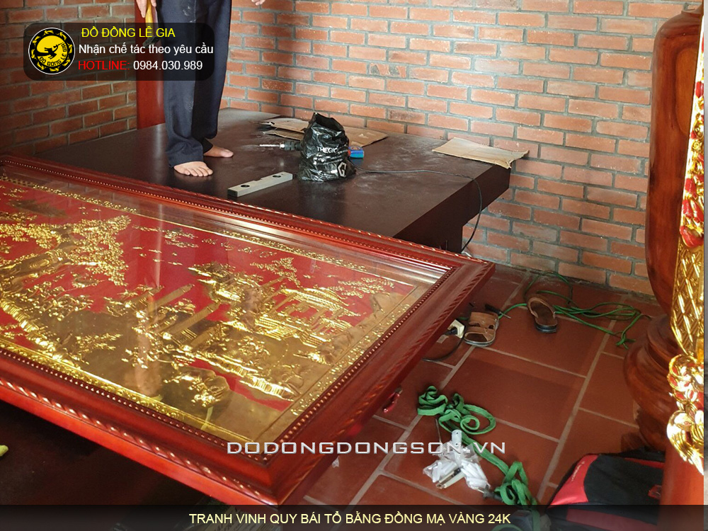 Tranh vinh quy bái tổ bằng đồng mạ vàng 24K nền đỏ có kích thước 197x107 cm tái hiện lại hình ảnh đoàn rước vô cùng long trọng. Tranh được chế tác hoàn toàn thủ công, khung tranh bằng gỗ gụ, bề mặt tranh được mạ vàng 24k thanh khiết nổi bật trên nền sơn đỏ. Đây xứng đáng là một tuyệt tác nghệ thuật độc đáo với vẻ đẹp lộng lẫy, cao sang, quyền quý.