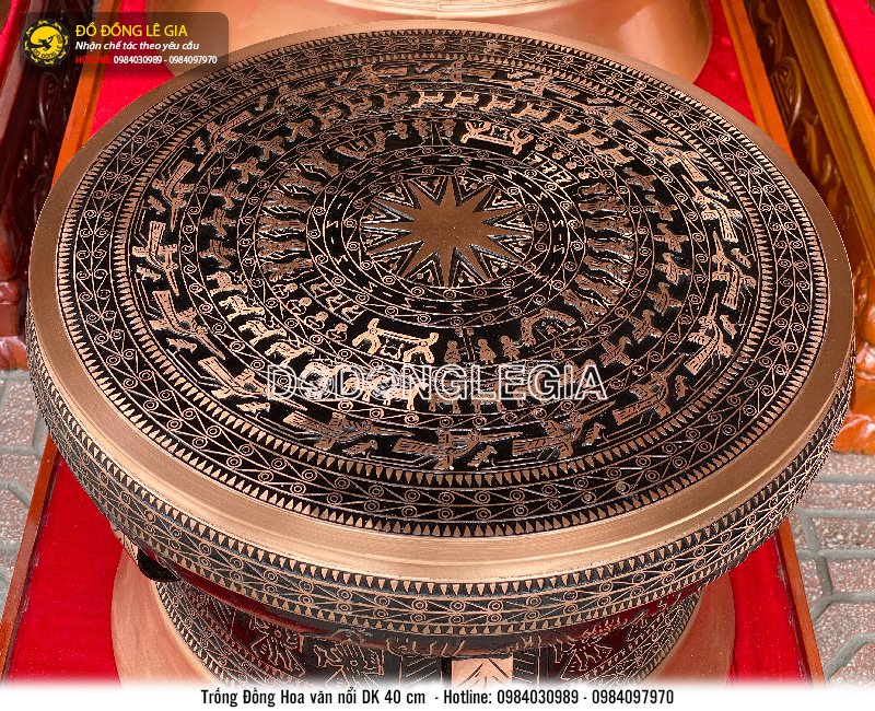 Trống Đồng Đông Sơn ĐK 40cm là dòng sản phẩm trống đồng phổ thông được chế tác từ bàn tay người nghệ nhân của Lê Gia. Trống được chế tác hoàn toàn thủ công theo phương pháp truyền thống. Đây là mẫu trống có kích thước khá phù hợp với nhiều không gian, màu sắc cách tân phù hợp cả cho không gian hiện đại.
