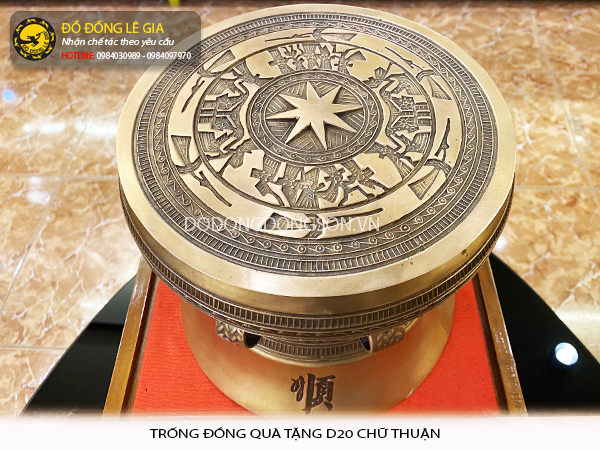 Những quả trống đồng quà tặng thường được chế tác với kích thước nhỏ nhắn, có vẻ đẹp tinh xảo vừa trang trọng, vừa thể hiện được tinh thần dân tộc cao cả. Vì thế sản phẩm này rất được ưa chuộng để làm quà tặng doanh nghiệp, cho khách nước ngoài. Hôm nay, Đồ đồng Đông Sơn xin gửi đến quý khách hàng mẫu trống đồng quà tặng chữ Thuận - sản phẩm độc đáo mới được ra mắt trên thị trường.
