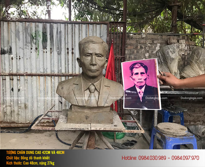Tượng chân dung cụ ông được đúc hoàn toàn thủ công theo phương pháp truyền thống. Mọi công đoạn đều làm thủ công bằng tay. Nguyên liệu đúc là loại đồng đỏ thanh khiết. Tượng chân dung cụ ông được tạo mẫu bằng khuôn đất. Sau khi được kiểm duyệt từ phía gia đình, chúng tôi chuyển sang tạo mẫu thạch cao và đúc khuôn đồng thành phẩm. Tượng được hoàn thiện sửa nguội đánh bóng bề mặt, khắc tên tuổi, năm sinh, năm mất tại chân đế pho tượng. Tượng có đầy đủ vai áo, cúc áo, vòng đeo cổ. Tượng được dát vàng 9999 lên toàn bộ bề mặt sản phẩm, giúp tượng sáng bóng, có màu vàng tươi, đặc biệt hơn vàng rất bền nên thời gian sử dụng sẽ rất lâu mà không sợ bị phai màu.