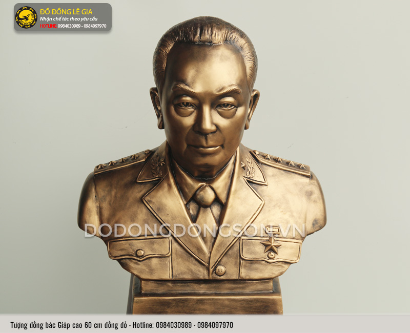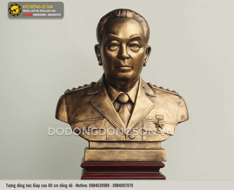 Tượng đại tướng Võ Nguyên Giáp 60cm đúc thủ công bằng đồng đỏ thanh khiết, không lẫn tạp chất. Tượng nặng khoảng 30kg, được chế tác theo mẫu chuẩn quốc gia do gia đình nhà đại tướng trực tiếp kiểm duyệt.