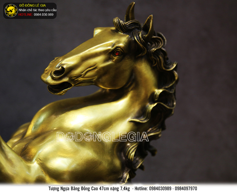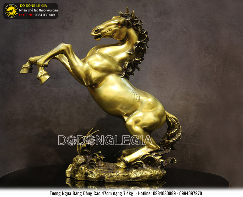 Tượng linh vật Ngựa được chế tác với rất nhiều hình dáng, song phổ biến nhất là Tượng khắc họa lại hình ảnh chú Ngựa đang phi hoặc giơ hai chân về phía trước sẵn sàng tư thế chiến đấu. Hình ảnh này được các nghệ nhân lành nghề của thương hiệu Đồ đồng Lê gia chế tác trên chất liệu đồng vàng, tư thế loài vật hiện lên chân thực, sống động.