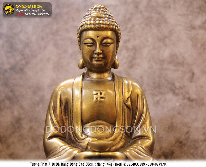 Tượng Phật A Di Đà ngồi trên đài sen khắc họa hình ảnh Phật ngồi xếp bằng trên tòa hoa sen, với thần thái rất ung dung tự tại nhưng thực chất đó là sự tịnh tâm để ngăn chặn mọi sức mạnh của quỷ dữ chống phá.