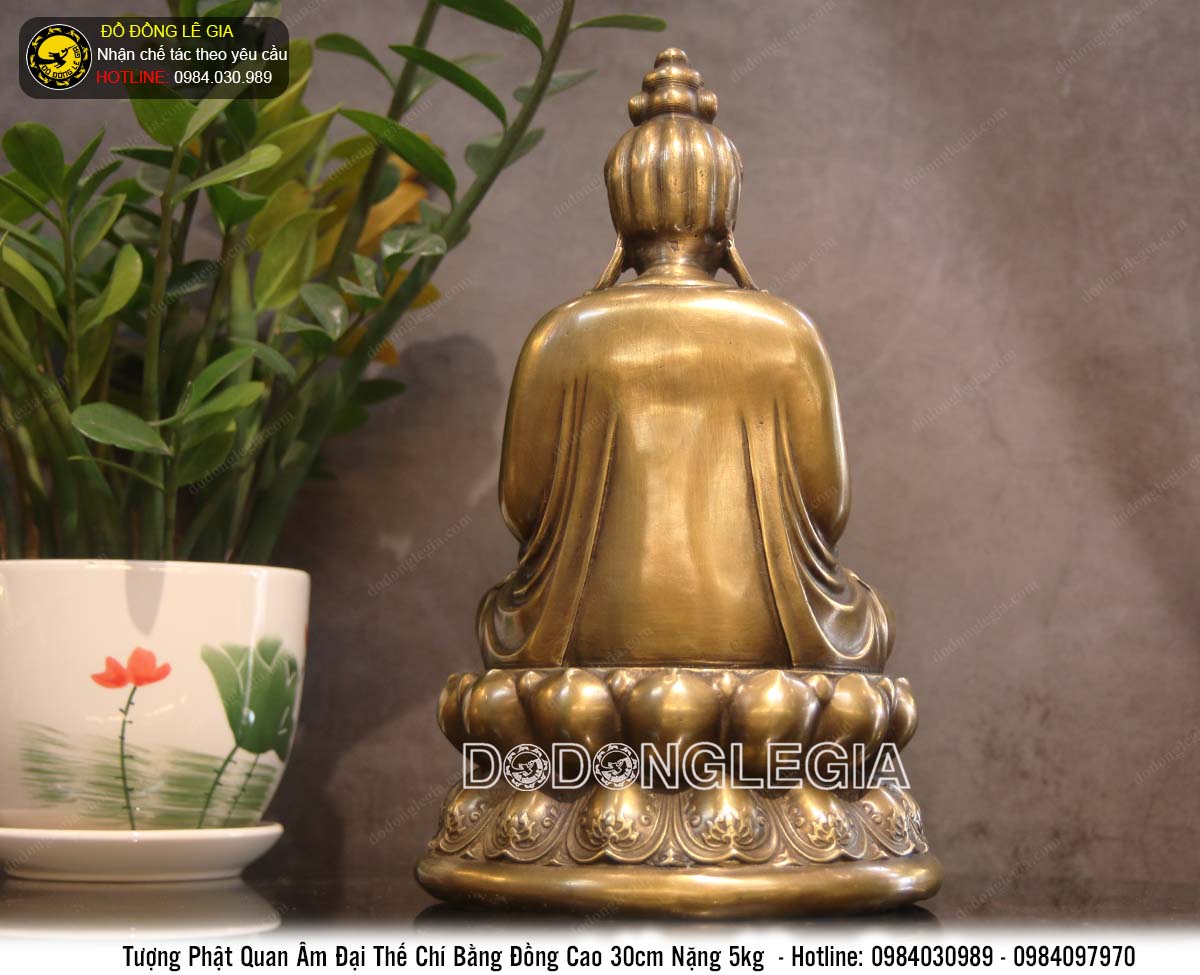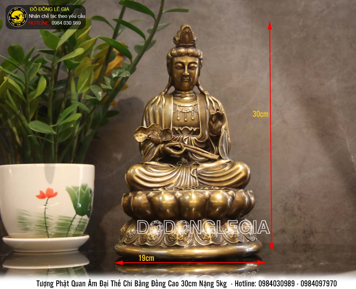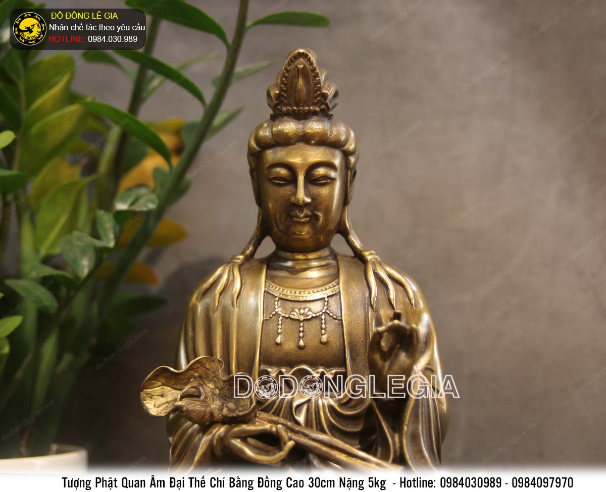 Bồ Tát ngồi trên đài hoa sen với cử chỉ, dáng điệu tao nhã và tôn nghiêm. Ngài ngồi theo tư thế kiết già, tay phải đưa về phía trước và ngang bụng. Còn tay trái của Ngài lại đưa lên, ngón trỏ và ngón giữa chụm lại. Trang phục mềm mại, mượt mà, phía trước ngực có sợi dây gắn ngọc rủ xuống. Mẫu Tượng phật Đại thế chí cao 30cm bằng đồng thau hun giả cổ với khuôn mặt phúc hậu tròn đầy. Chân mày cong, đôi mắt khép hờ, miệng mỉm cười, dáng tai dài, mái tóc Ngài giống như một đóa sen. Phía trước còn một chiếc bình, bao xung quanh là hình ảnh một ngôi chùa.