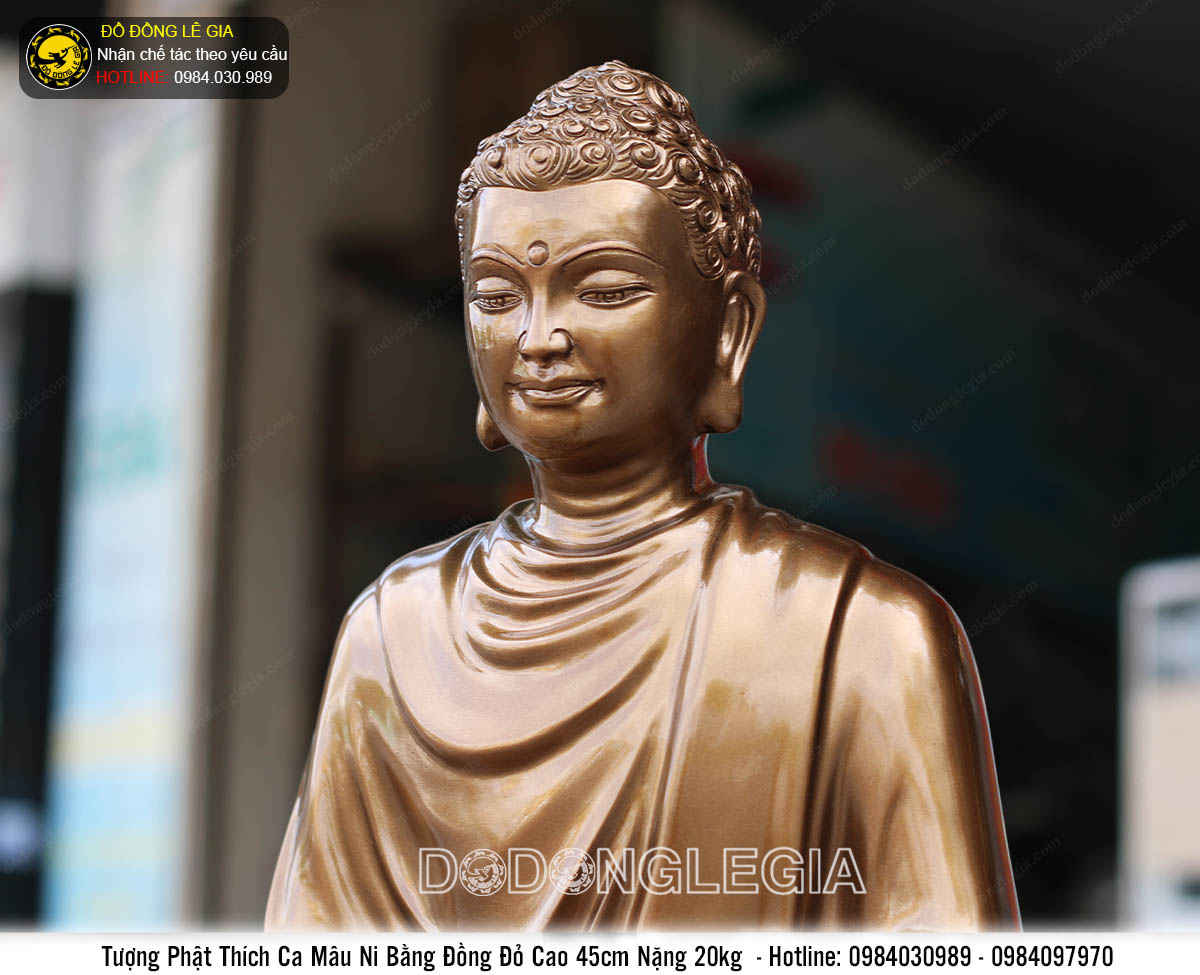| Điểm mạnh về độ tinh xảo | Với chất liệu đồng nguyên chất Tượng phật Thích ca đúc bằng đồng đỏ làm màu giả cổ cao 45cm được các nghệ nhân thực hiện công phu. Đó là quá trình hun xuống màu giả cổ, mang đến bầu không khí thiêng liêng. |