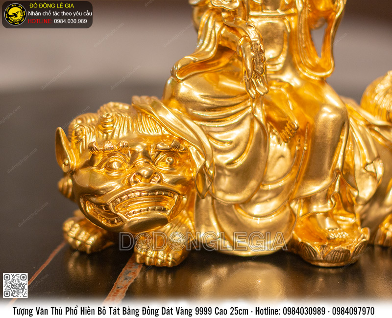 Tượng Văn Thù Phổ Hiền thếp vàng 9999 được đúc hoàn toàn thủ công. Tượng được đúc với hình dáng là Phật Phổ Hiền cưỡi voi và Phật Văn Thù cưỡi sư tử. Điều đặc biệt ở sản phẩm này là tượng được dát vàng 9999. Nó đã tạo nên cho sản phẩm một màu sắc đặc trưng, sang trọng và tinh túy.