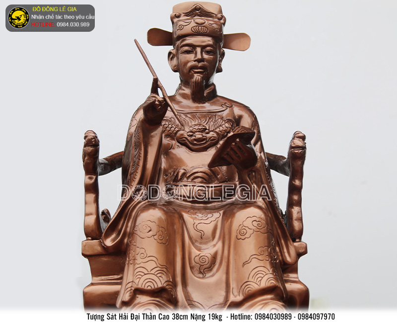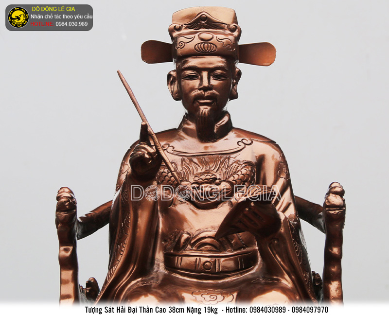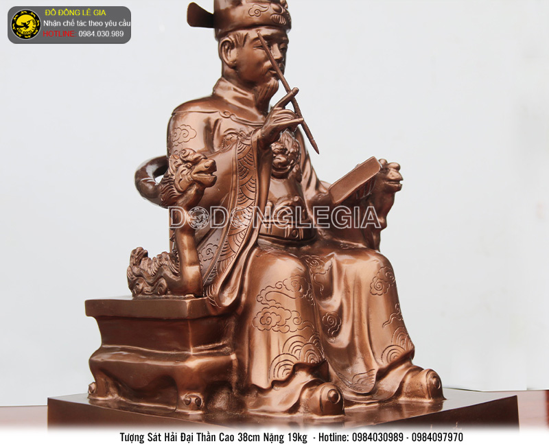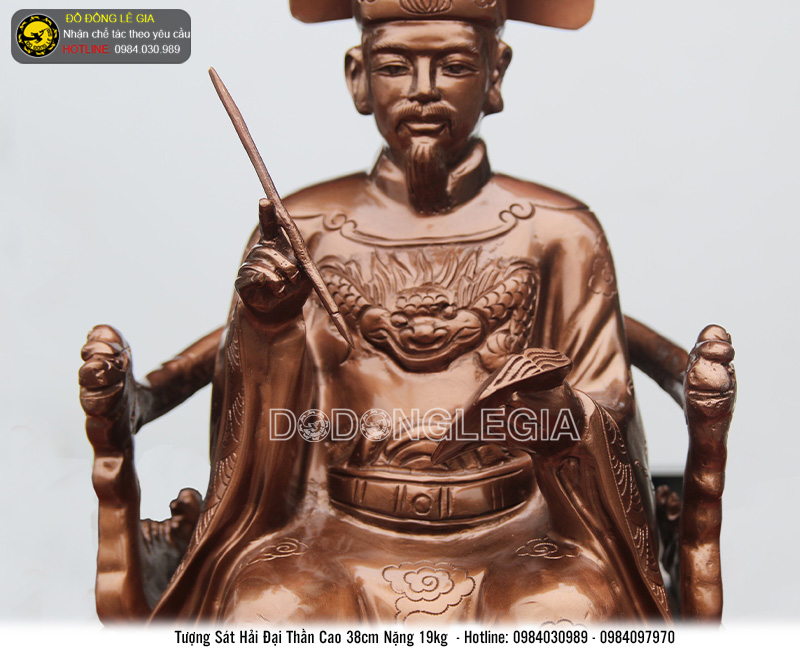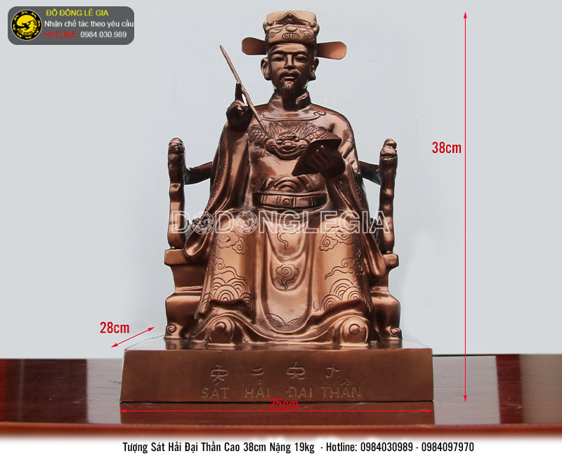 Tượng Sát Hải Đại Thần cỡ nhỏ chế tác theo yêu cầu của khách hàng bằng chất liệu Đồng đỏ hun nâu với Quy cách Đúc thủ công khuôn đất. Tượng cao 38cm và nặng khoảng 19kg. Bức tượng Sát Hải Đại Vương được các nghệ nhân lành nghề của thương hiệu Đồ đồng Legia chế tác một cách tỉ mỉ nhằm khắc họa được đường nét vị danh nhân của dân tộc một cách tinh xảo, giữ được nét uy nghiêm, vị thế.