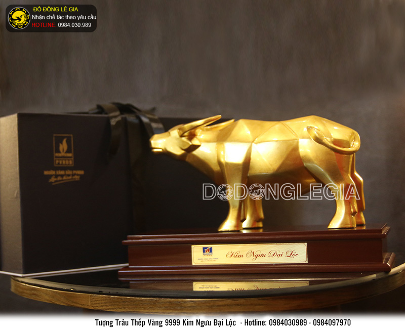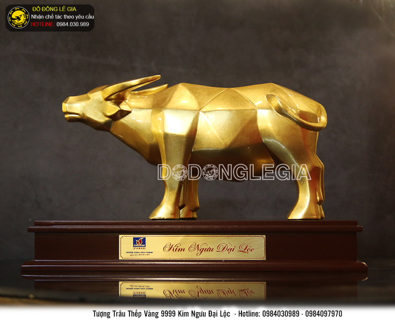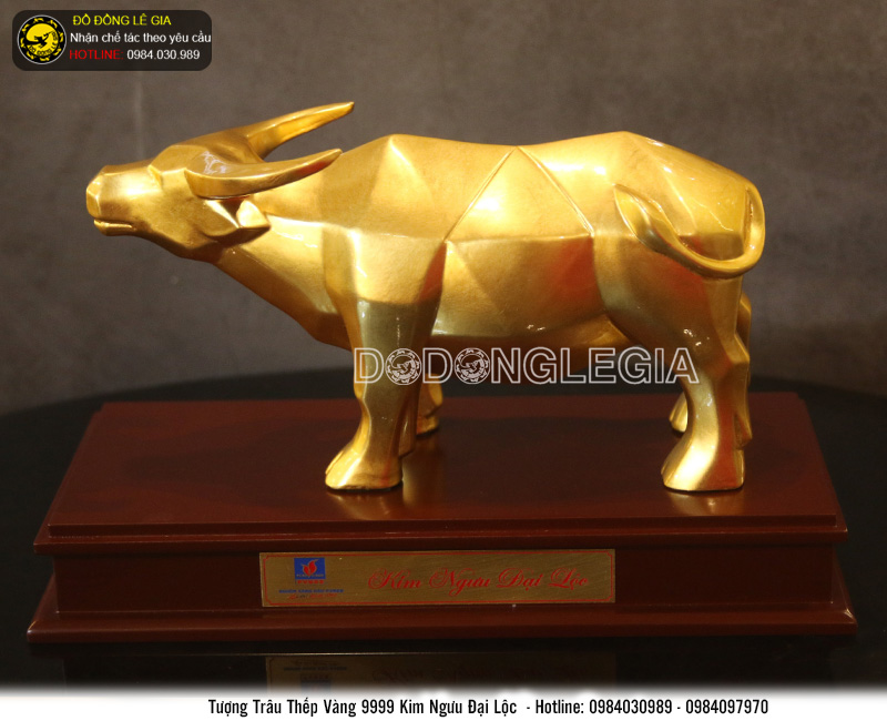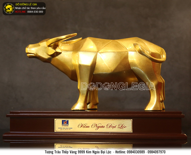 Tượng Trâu Kim Ngưu Đại Lộc là mẫu tượng Trâu ấn tượng, được rất nhiều khách hàng ưa chuộng. Tượng trâu được đúc đồng đỏ, bề mặt phủ thiếp vàng 9999. Mẫu tượng được thiết kế cách điệu nhưng vẫn giữ được nét khỏe khoắn, bệ vệ.